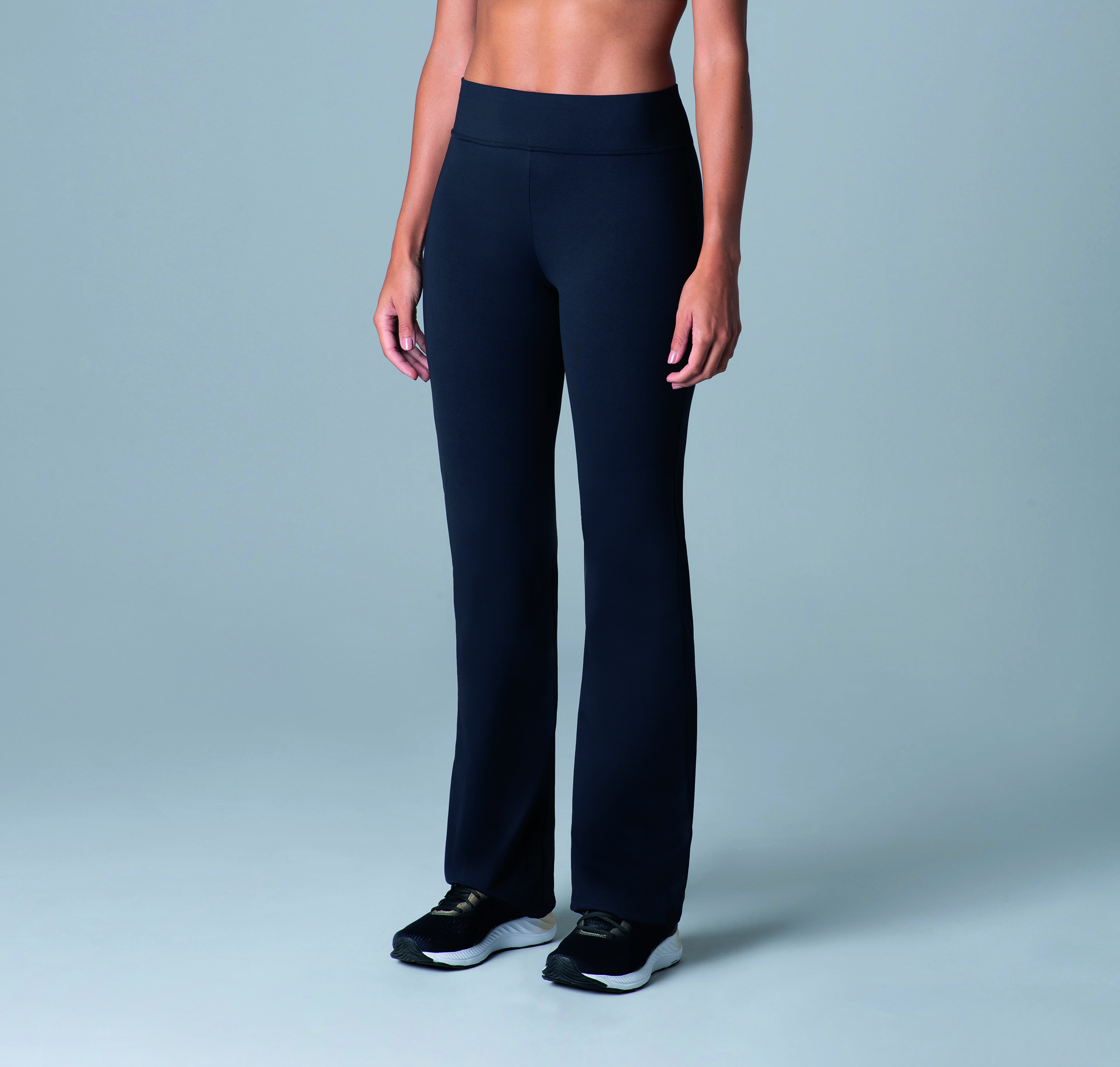 Calza larga recta con cintura alta que modela la silueta.